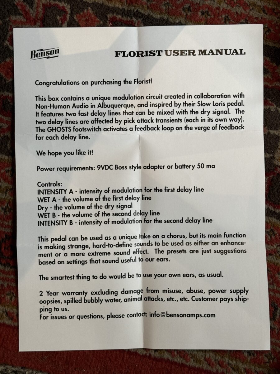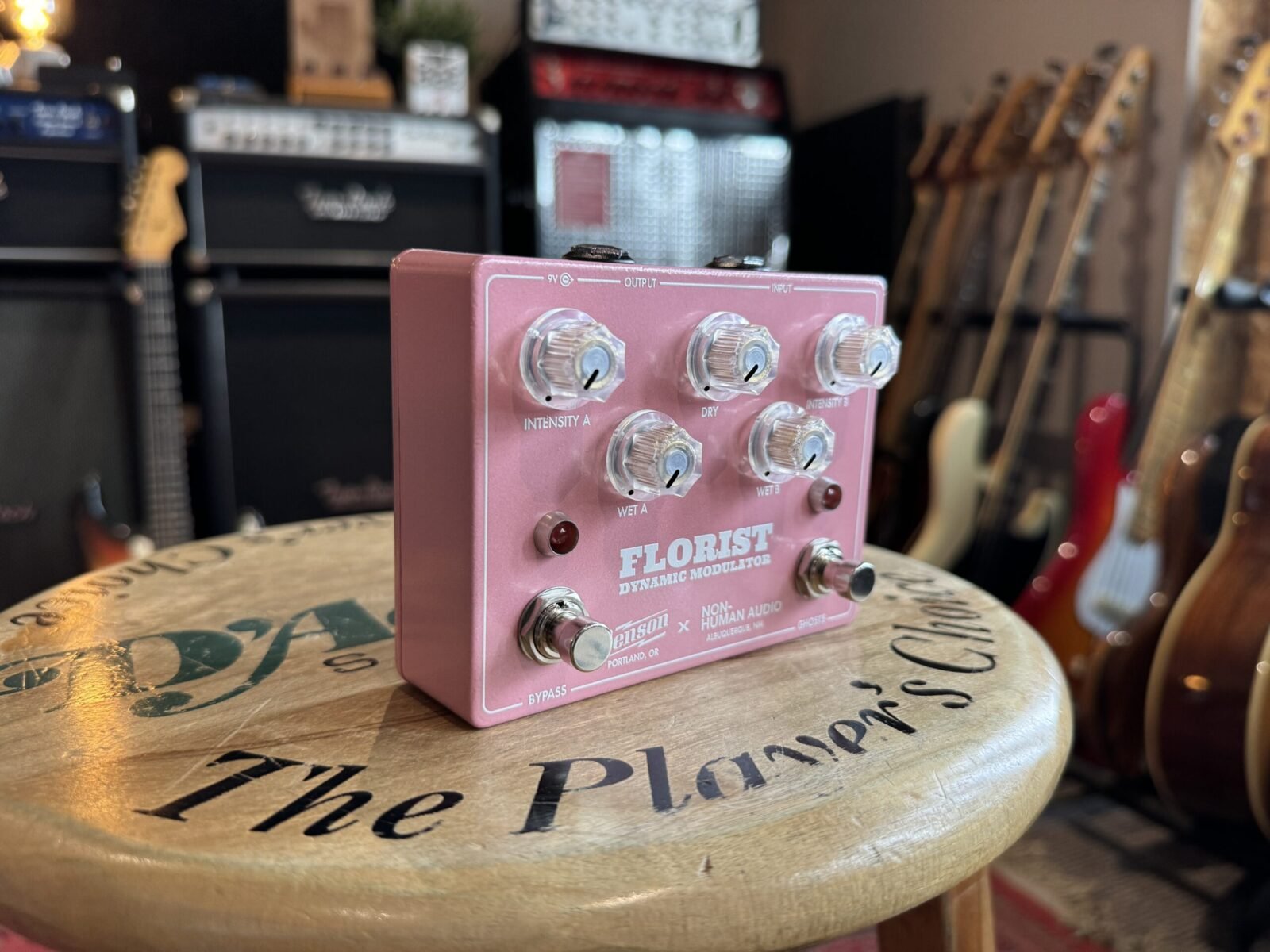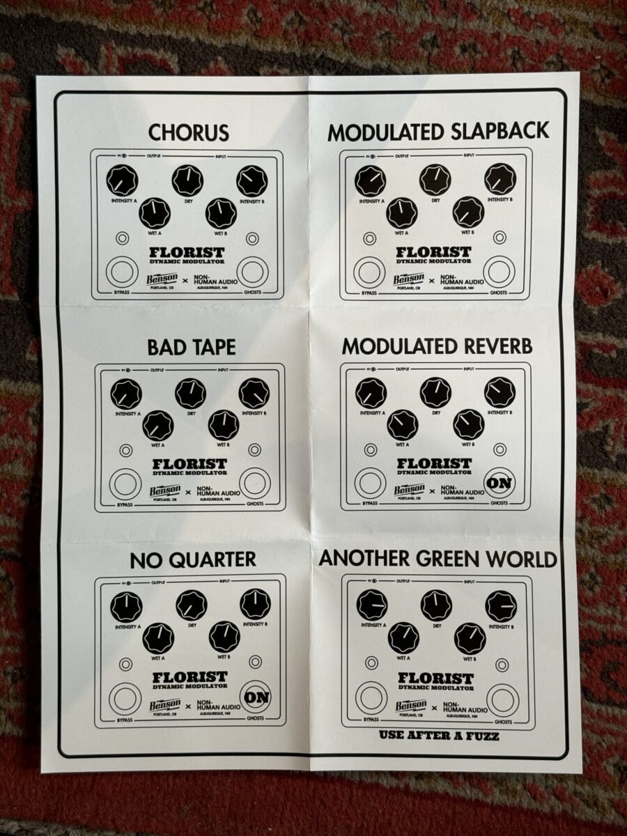 While the Florist starts with the core idea of the Slow Loris, it is something else entirely and is not a revision or modification of the original. For instance, the delay range on the Florist is way faster than the original. We also redesigned the signal path for higher fidelity, and use a compressor type detector circuit for controlling the delay speed. We add a second delay channel using its own different detector to try to achieve some through-zero flanging and tri-chorus sounds. The two wet signals and the dry signal have independent volume control (DRY, WET A, and WET B) to blend the signals together. The two wet signals have independent intensity controls (INTENSITY A and INTENSITY B) corresponding to the respective volume controls.