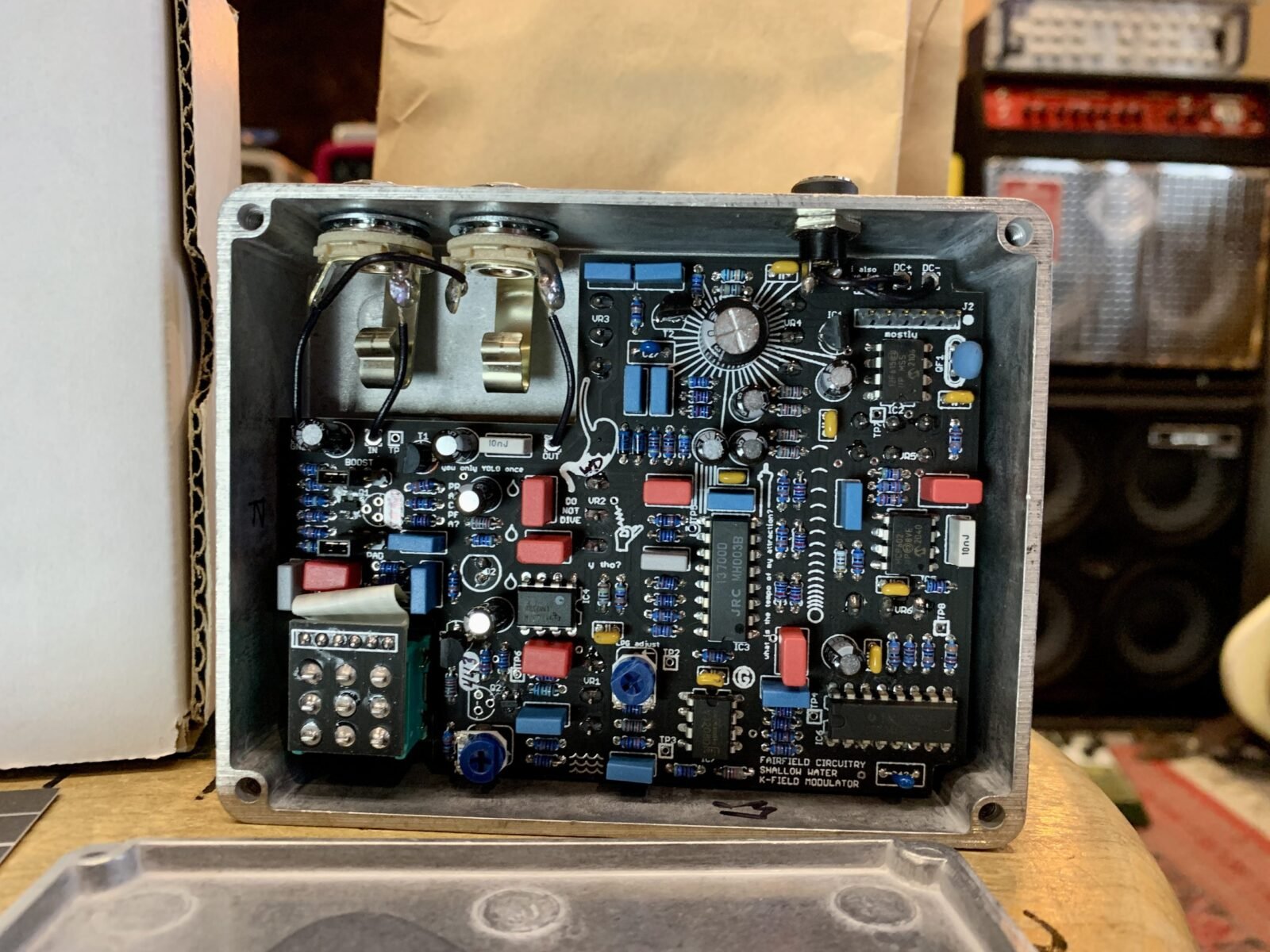 Prácticamente, dun efecto construido alrededor del típico circuito de chorus/vibrato analógico en el que la señal se retrasa unas docenas de milisegundos utilizando un dispositivo de brigada de cubos. A continuación, otra señal modula este tiempo de retardo para crear cambios en el tono, denominados vibrato. El coro se consigue mezclando la señal original con la señal retardada, creando los filtros de peine en movimiento que nos hacen cosquillas en los oídos y nos hacen sentir el flequillo. Sin embargo, al estudiar la arquitectura del modulador de campo k se aprecian grandes diferencias. Las más llamativas son cómo se modula el tiempo de retardo de forma aleatoria y cómo se mueve el filtro de recuperación en relación con la señal de entrada. Estas dos diferencias sitúan a Shallow Water en una categoría propia, denominada apropiadamente moduladores de campo K. Al perderse el presente, el futuro se convierte en el pasado.