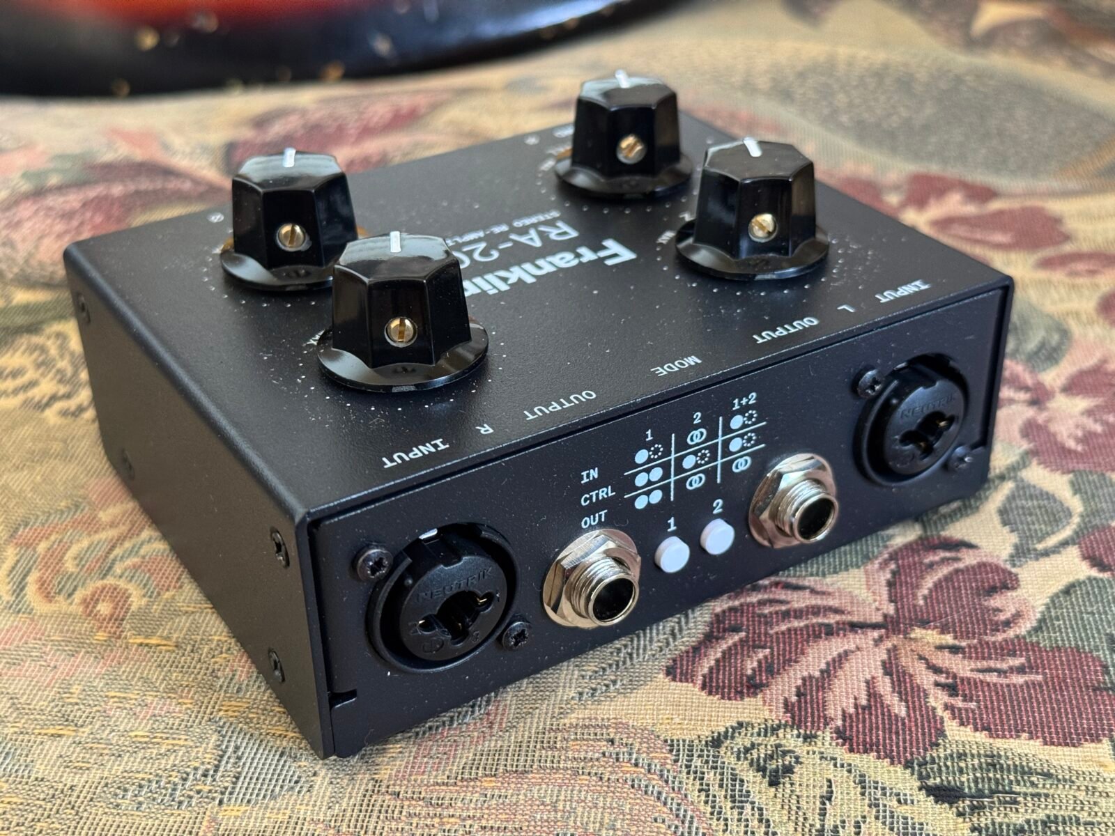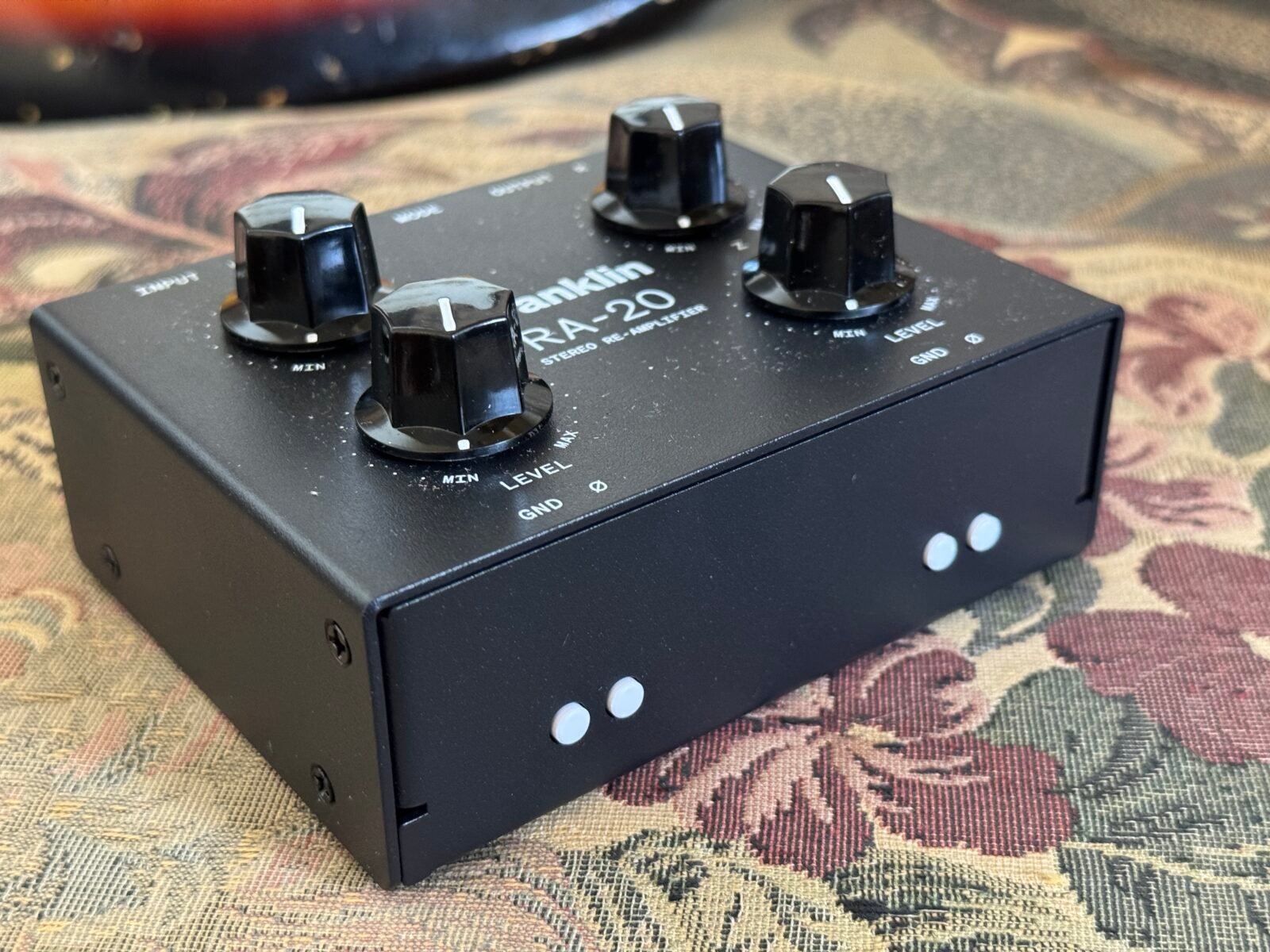 El Franklin Audio RA-20 Dual Re-Amplifier es la versión estéreo del reamp pasivo de Franklin: un convertidor de nivel de línea balanceado → nivel instrumento para mandar pistas del DAW (o de una mesa/interfaz) a pedales y amplificadores, con una diferencia clave: aquí tienes dos canales y cuatro modos de ruteo para cubrir prácticamente cualquier combinación de mono y estéreo.