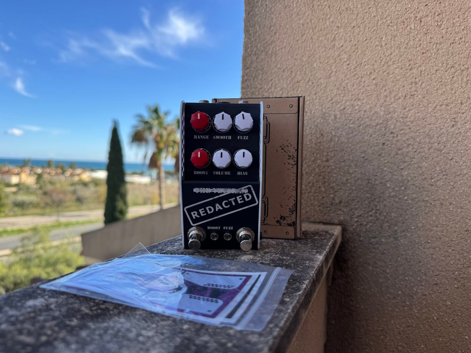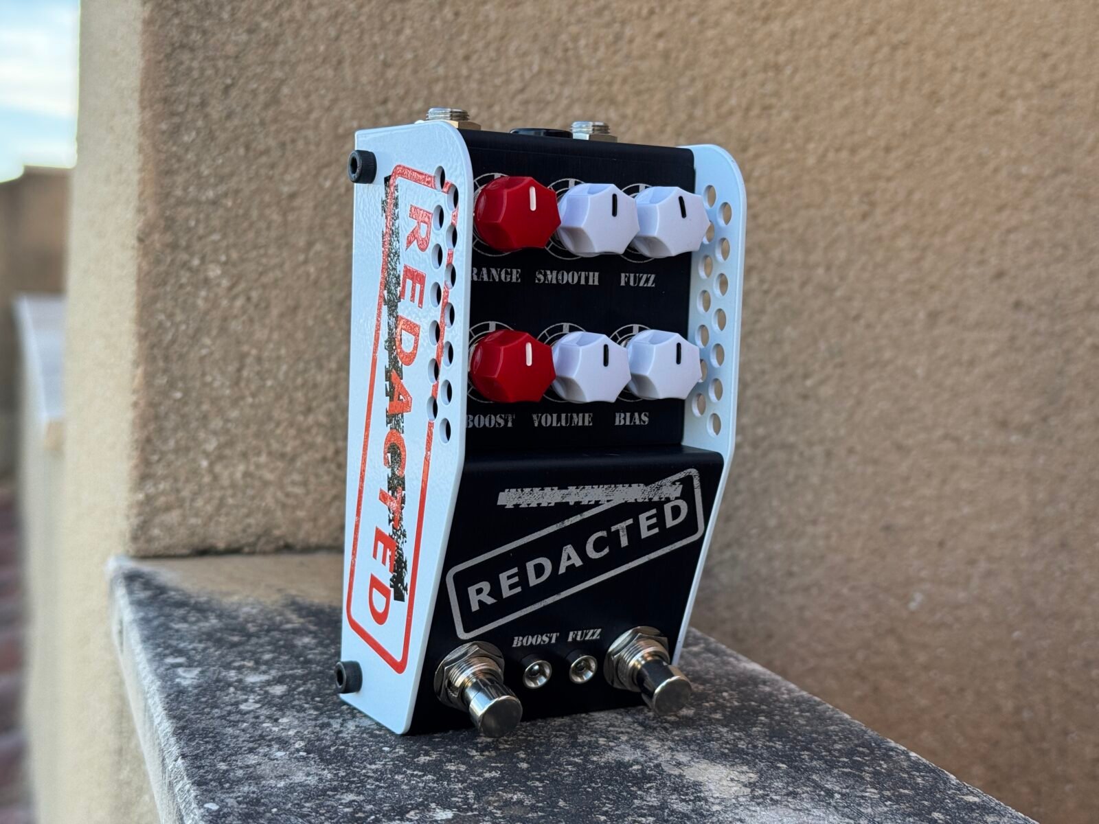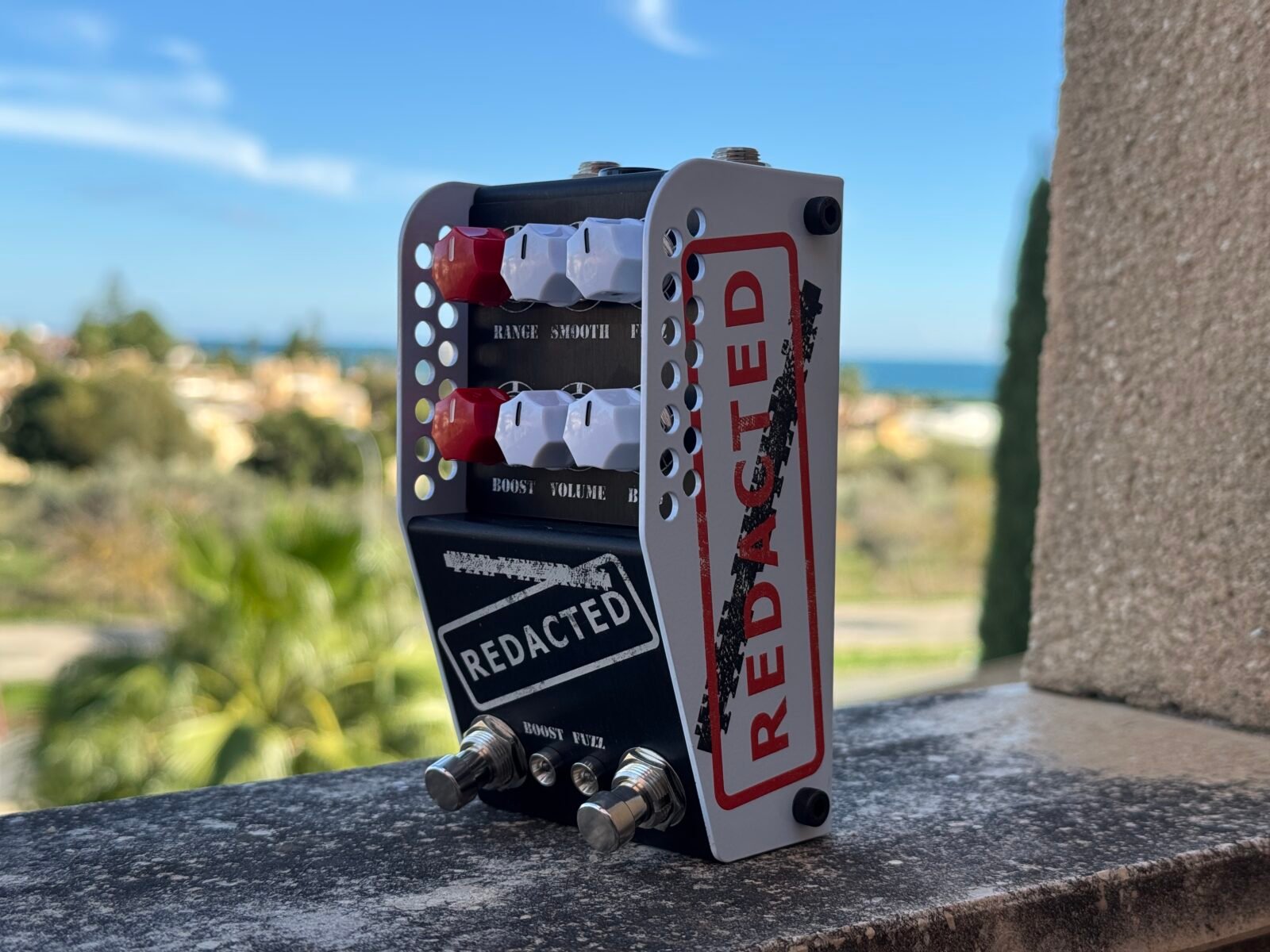 Aunque pueda recordar a los Have Blue y Tacit Blue, el Redacted se mueve claramente en otro terreno. Aquí se utilizan transistores de germanio mil-spec cuidadosamente seleccionados, con un carácter más firme, mayor empuje y una respuesta más inmediata. El resultado es un fuzz con una salida muy elevada y un rango dinámico enorme, capaz de sonar masivo incluso con los controles muy por debajo del mediodía.